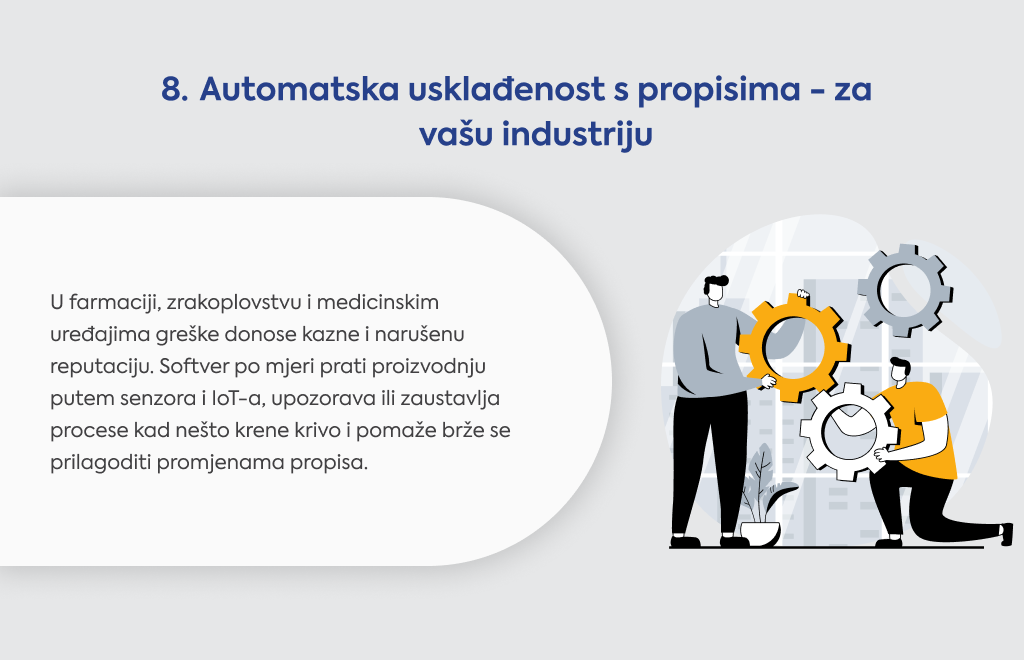 Software po mjeri eliminira te stalne troškove, a donosi konkretne rezultate: manje plaćate radnike za ručne poslove, manje grešaka u proizvodnji i puno veća produktivnost jer sve teče glatko.