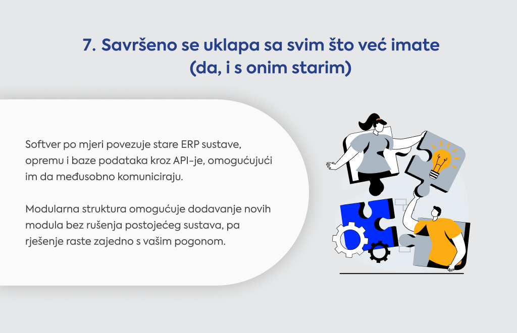 Software po mjeri povezuje sve to kroz API-je i alate koji prevode između sustava koji inače ne razgovaraju.