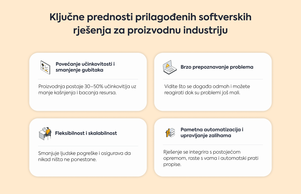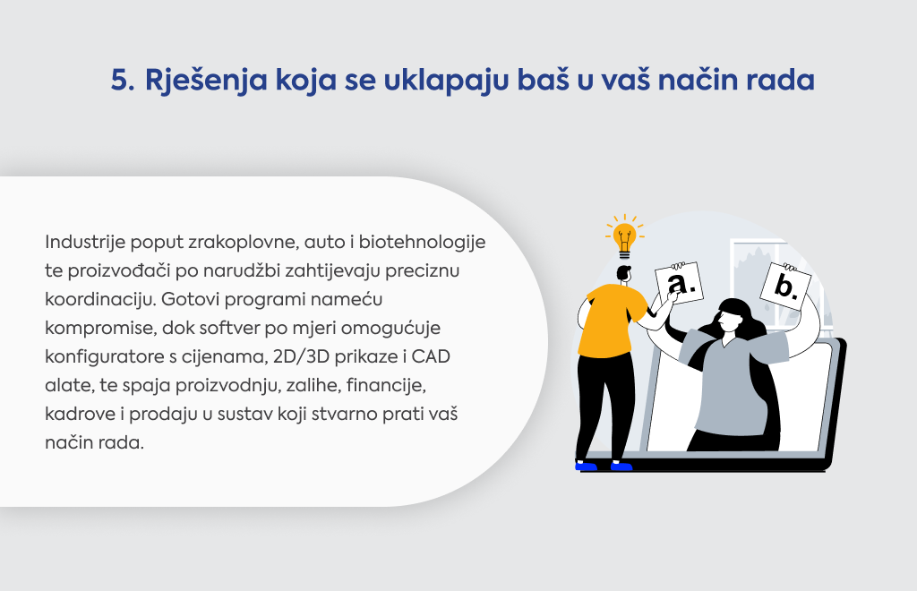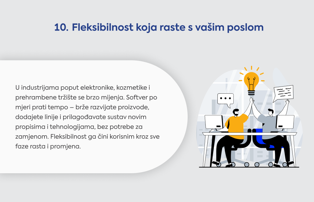 Software po mjeri se prilagođava vašem tempu - brže razvijate nove proizvode, dodajete linije bez rušenja sustava, širite se glatko.