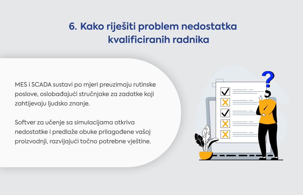 MES ili SCADA sustavi po mjeri preuzimaju rutinske poslove - pale i gase strojeve, mijenjaju brzine traka - pa vaši stručnjaci mogu raditi ono što zaista zahtijeva ljudsko znanje.