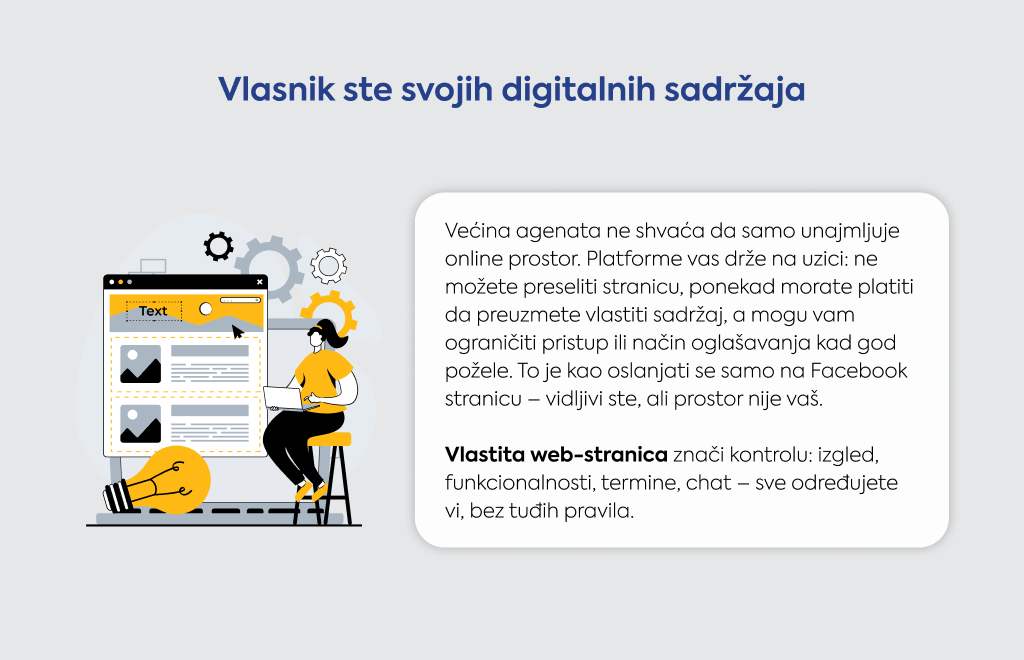 Koristite tuđe platforme koje vas drže na uzici. Ne možete "preseliti" svoju stranicu kad želite otići.