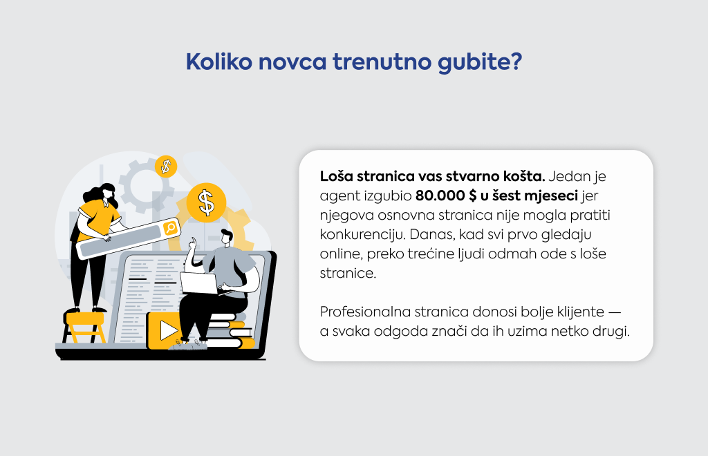 Koliko vas košta loša stranica? Gubite 35% potencijalnih kupaca koji odmah odu, a jedan kolega je izgubio 80.000 dolara provizije u pola godine zbog katastrofalne stranice