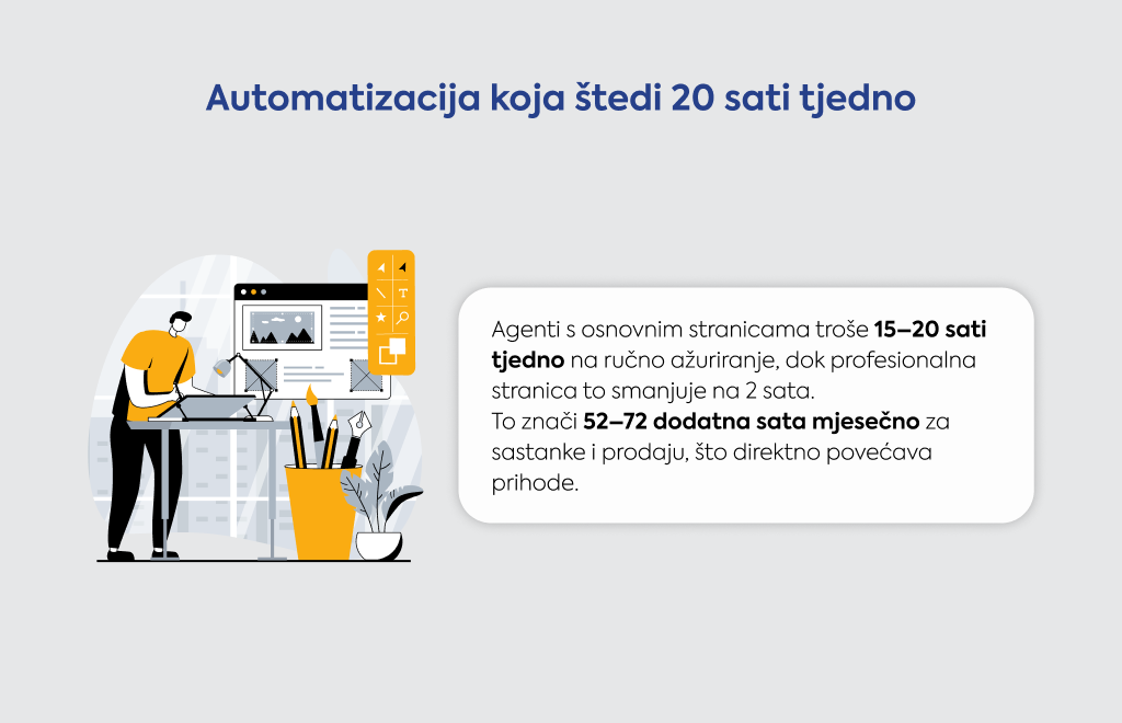 Znate koliko vremena gubite na ručno ažuriranje stranice? Agenti s osnovnim stranicama troše 15-20 sati tjedno na poslove koji bi trebali biti automatski.