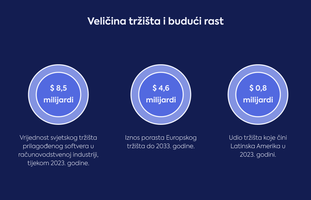 Tijekom 2023. godine, svjetsko tržište prilagođenog softvera u računovodstvenoj industriji vrijedilo je 8,5 milijardi dolara.