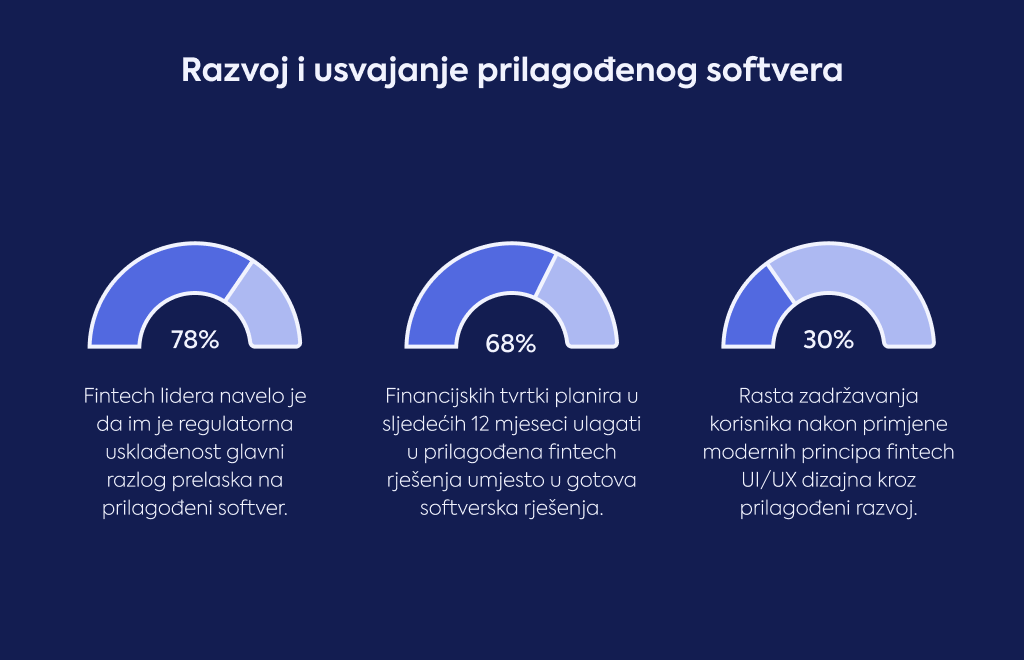 U istraživanju iz 2025., 78% fintech lidera navelo je da im je regulatorna usklađenost glavni razlog prelaska na prilagođeni softver.