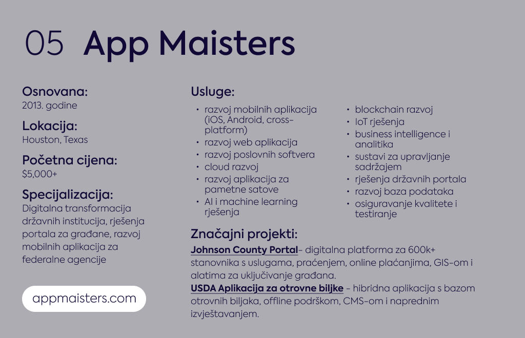Usluge: Prilagođeni razvoj mobilnih aplikacija (iOS, Android, Flutter, React Native), razvoj web aplikacija, MVP razvoj, razvoj zdravstvenih aplikacija, HIPAA-usklađena rješenja, prilagođeni razvoj softvera, UI/UX dizajn, osiguravanje kvalitete i testiranje, DevOps automatizacija, savjetovanje za startupove