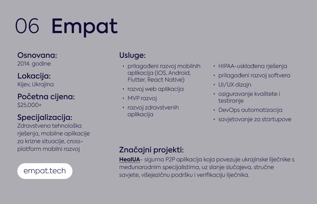 Empat: specijalizirani za zdravstvene tehnologije i rješenja za krizne situacije, povezujući 2.200+ liječnika širom svijeta kroz sigurne platforme