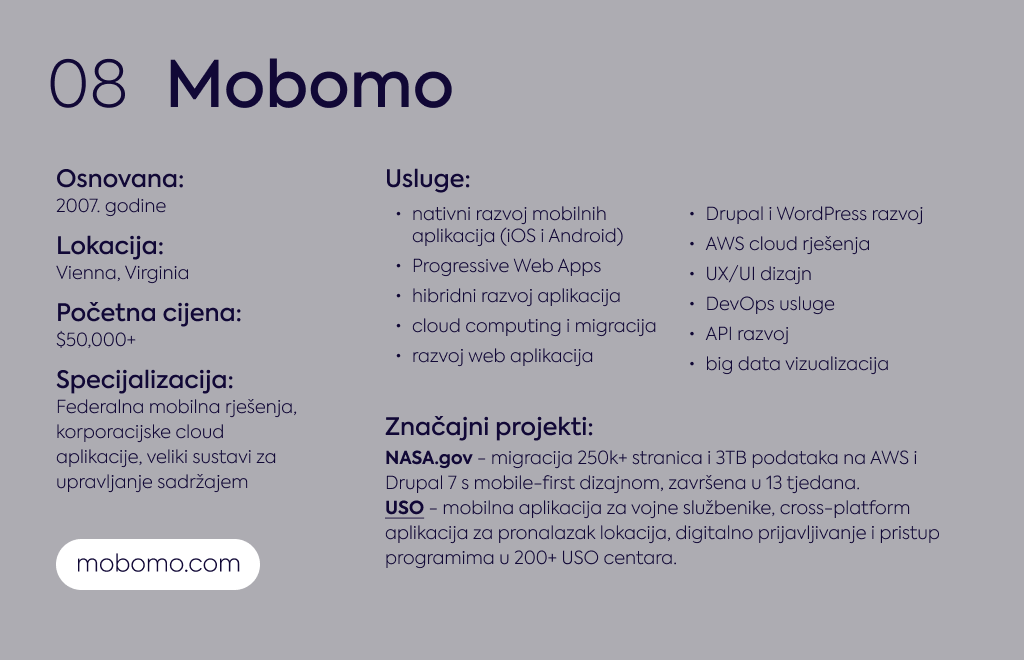 Mobomo: rukuje velikim federalnim projektima za agencije poput NASA-e, isporučujući 50+ aplikacija godišnje s CMMI Dev Level 3 certifikacijom