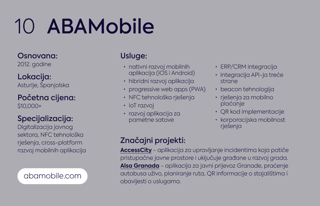 Usluge: Nativni razvoj mobilnih aplikacija (iOS i Android), hibridni razvoj aplikacija, progressive web apps (PWA), NFC tehnološka rješenja, IoT razvoj, razvoj aplikacija za pametne satove, ERP/CRM integracija, integracija API-ja treće strane, beacon tehnologija, rješenja za mobilno plaćanje, QR kod implementacije, korporacijska mobilnost rješenja