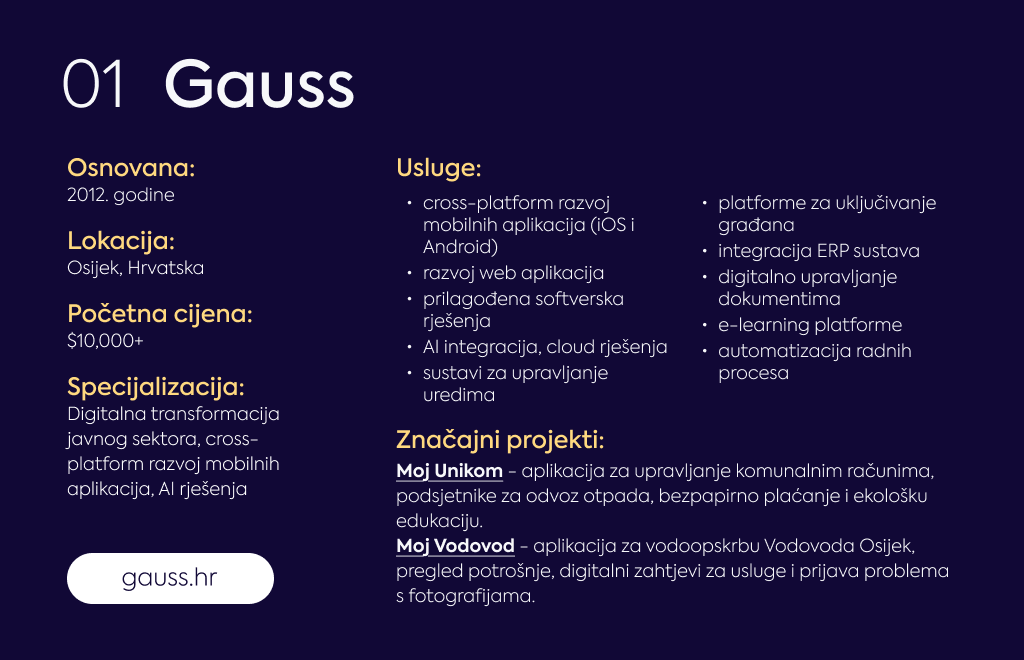 Gauss: nudi specijaliziranu ekspertizu za javni sektor s vlastitim Gauss Reflect sustavom i iskustvom regulatorne usklađenosti, što ih čini idealnima za projekte digitalne transformacije državnih institucija