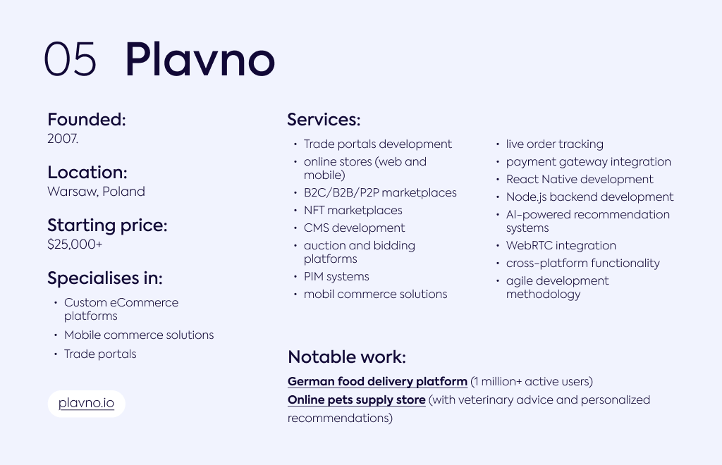 Plavno specializes in comprehensive eCommerce ecosystems with 300+ successful projects over 15 years, excelling in complex B2B trade portals and multi-vendor marketplaces.