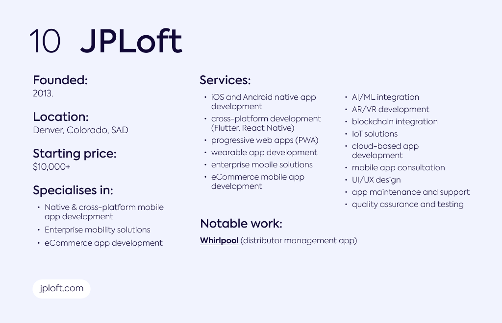 JPLoft delivers enterprise-grade mobile applications with 1100+ completed projects, specializing in distributor management systems for industry leaders like Whirlpool and Nike.