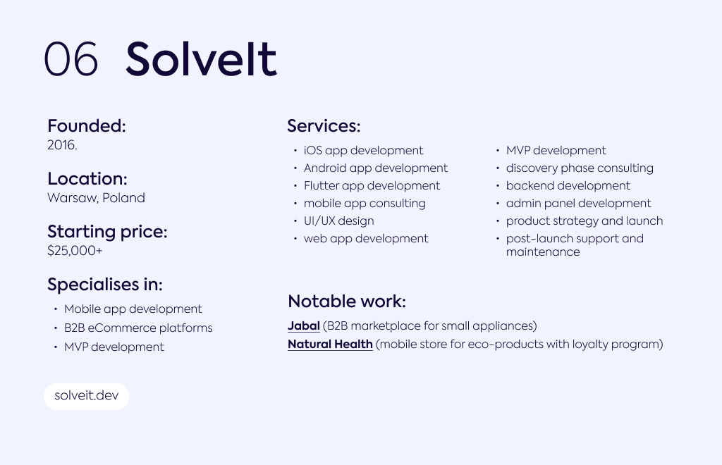 SolveIt focuses on rapid MVP development and scalable eCommerce solutions with tight deadline delivery, offering complete discovery phase to post-launch support services.