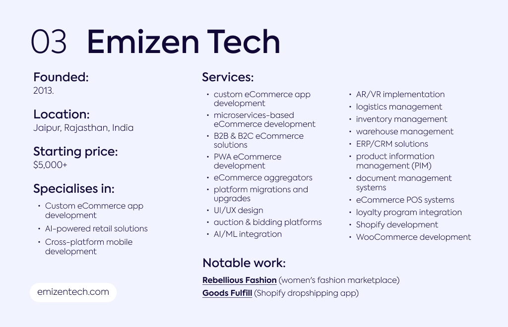 With over 11 years of industry experience and a substantial team of 250+ members, Emizen Tech brings serious depth to eCommerce development across multiple verticals.