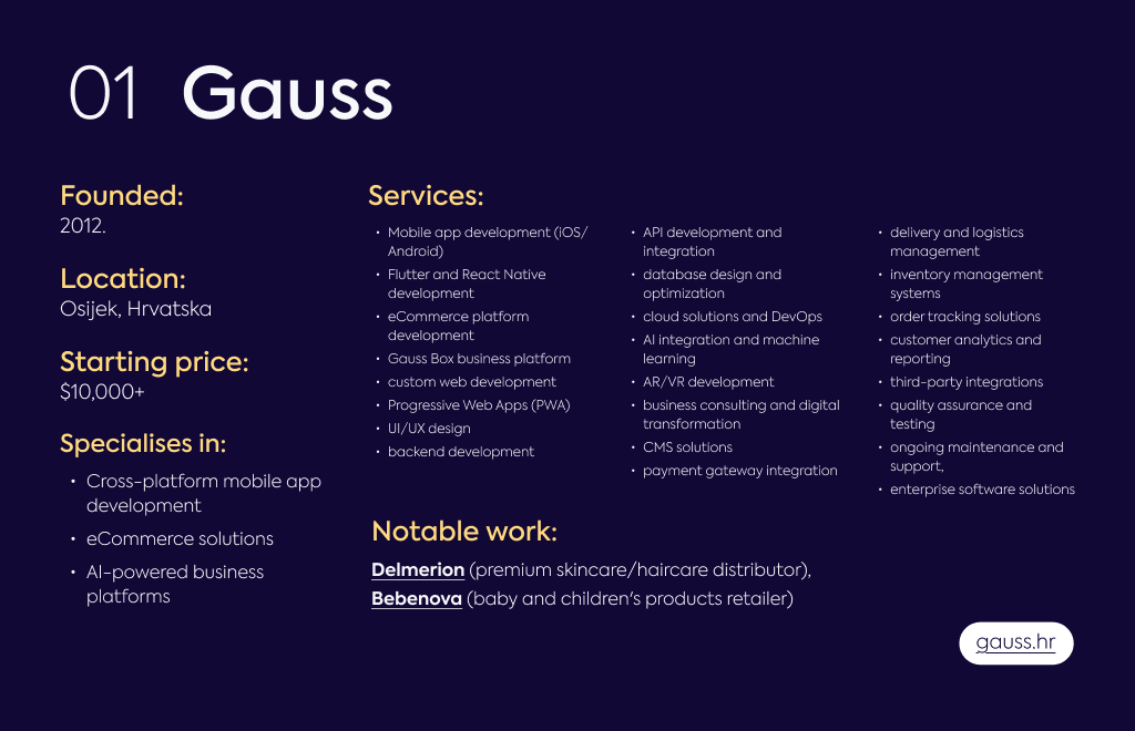 Gauss combines proven expertise with 70+ specialists and proprietary technology stack, delivering unified mobile-web-business management solutions for premium retailers like Delmerion while earning external validation as a Deloitte-recognized industry leader.