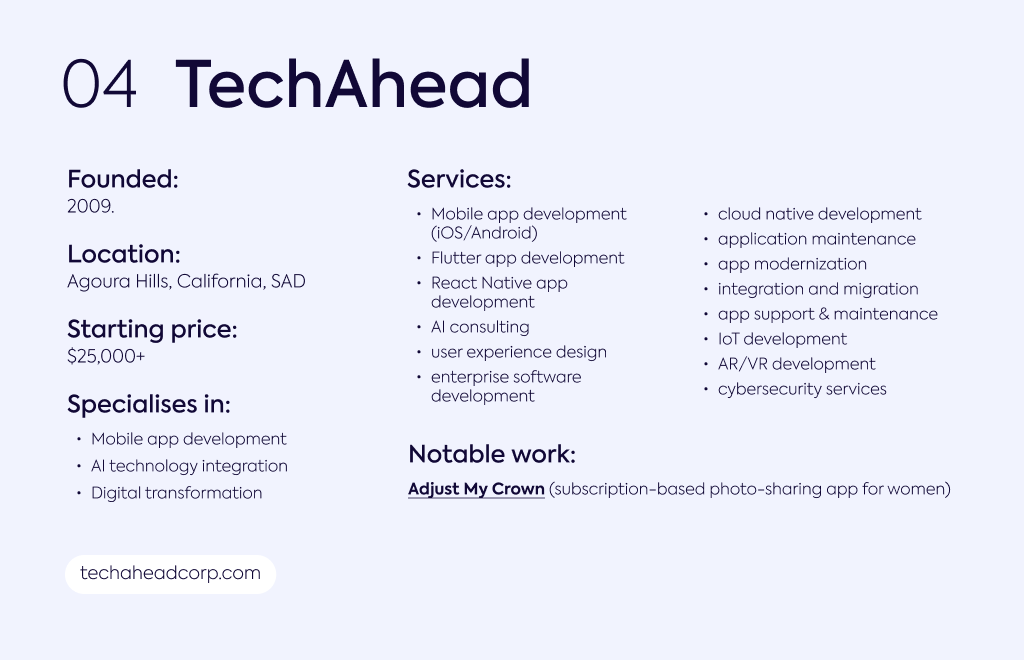 TechAhead brings 15+ years of Fortune 500 experience with clients like American Express, Audi, and Disney, using a strategic hybrid model combining LA designers with Delhi programmers.