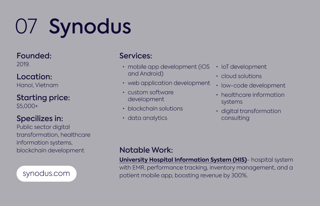 Services: Mobile app development (iOS and Android), web application development, custom software development, blockchain solutions, data analytics, IoT development, cloud solutions, low-code development, healthcare information systems, digital transformation consulting