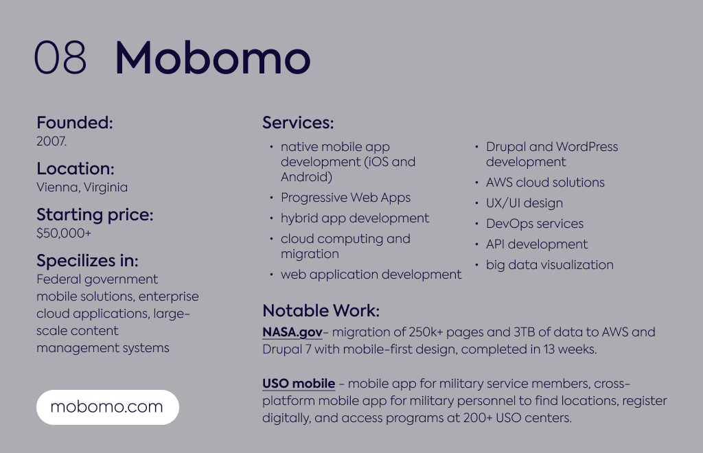 Mobomo handles large-scale federal projects for agencies like NASA, shipping 50+ apps annually with CMMI Dev Level 3 certification