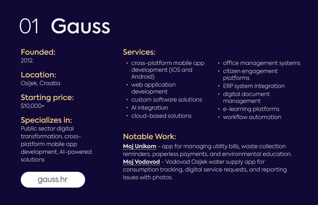 Notable Work: Moj Unikom waste management app for Unikom (A cross-platform digital platform enabling citizens to manage utility bills, receive waste collection reminders, make paperless payments, and access eco-friendly education resources), Moj Vodovod water utility app for Vodovod Osijek (A modernized water utility application providing annual consumption overviews, digital service request forms, and issue reporting with image attachment capabilities)