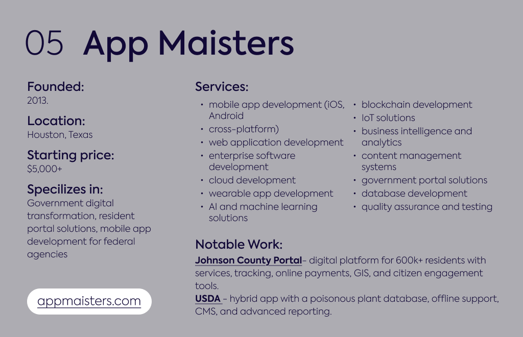 App Maisters provides certified government contractor status with SBA 8(a) certification and 400+ completed projects across federal agencies